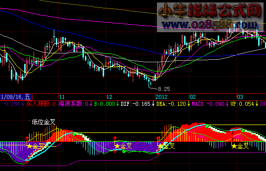 低位金叉:=CROSS(DIFF,DEA) AND DIFF<-0.1,COLORMAGENTA;