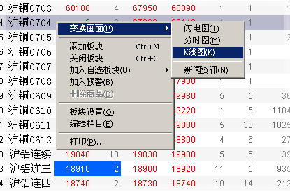 方法三:在行情报价窗口里选择品种后,单击鼠标右键,在“变换画面”中