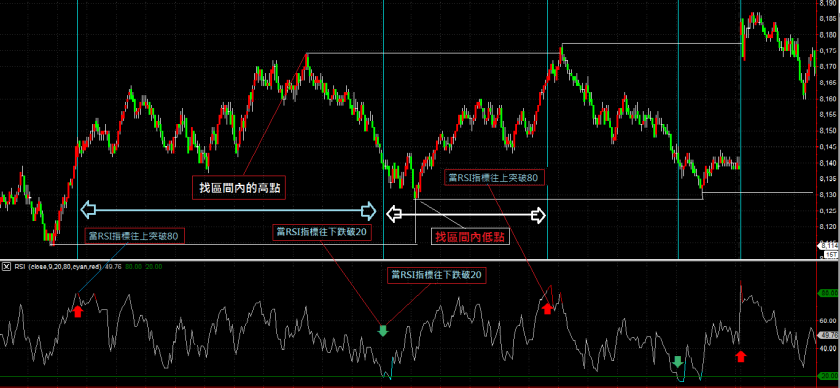 当RSI往上突破80时确认前区间的低点(画延伸线),并从突破点开始等他跌落到20以下时确认区间内的高点(并画延伸线)