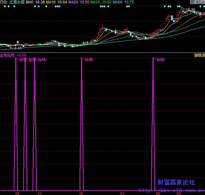 分享 金兔抢钱------副图 选股 源码 附图 导入说明 无未来 没有百分百的指标,指标只能做参考,最终判断在个人,分享下心得:使用该指标,见图:当判定大市做多的时候我们可依指标操做,如图里前三个指标它是在横盘时发出信号,这时我们可以设为观察,不需急于去买,等到后两个信号出现(最好是配合日K线均线多头排列的个股里的),并有起动特征的,这时出手,可是必有斩获哦~~~~ 导入说明:(注 该指标只做为技术交流,不作任何投资依据)用法:分析盘面趋势 详可见图: 指标镶入步骤: 工具→公式管理→常用→技术指标→(或选股)→新建→名称和描述→粘贴指标源码→确定