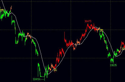 空头: 以绿色k线表示,并出现"卖"字样提示.