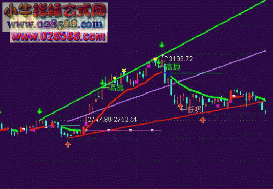 DRAWTEXT(CROSS(庄家,散户) AND 散户>70,H+0.05,'←高抛'),COLORGREEN;