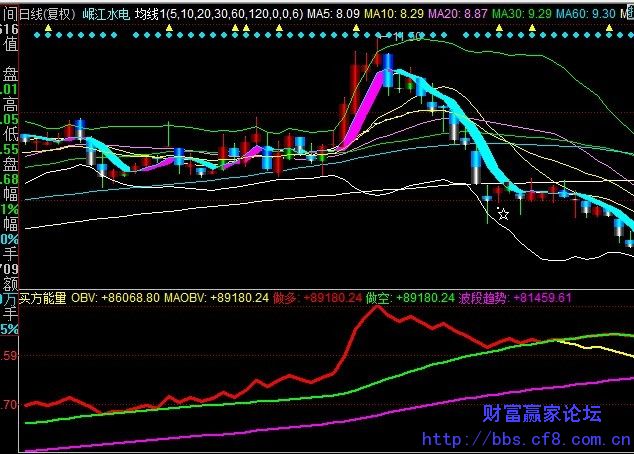 输出波段趋势 :OBV的72日简单移动平均,线宽为2,COLORFF00FF