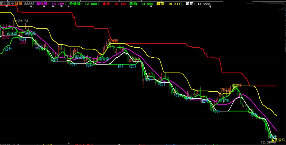 输出箱顶:昨日13日内上收的最高值的3日简单移动平均,画黄色,线宽为2