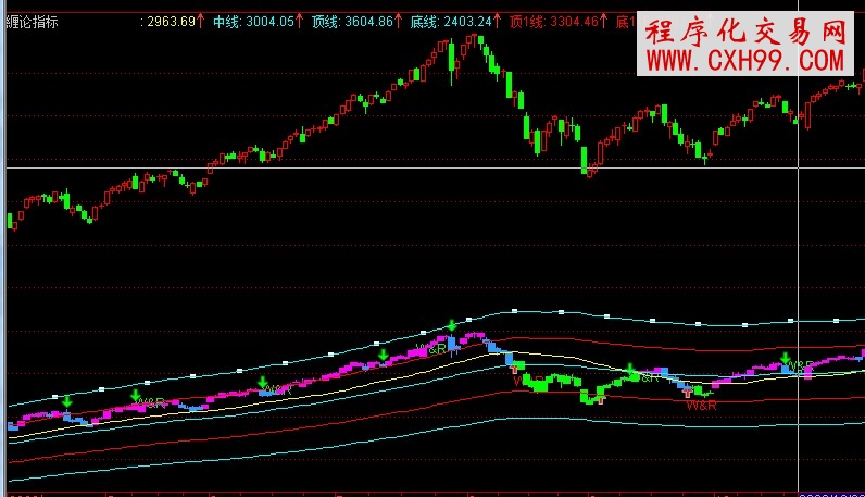 DRAWTEXT(FILTER(CROSS(0 -19,-WR),21),H*1.03,'W&R'),,COLORGREEN;