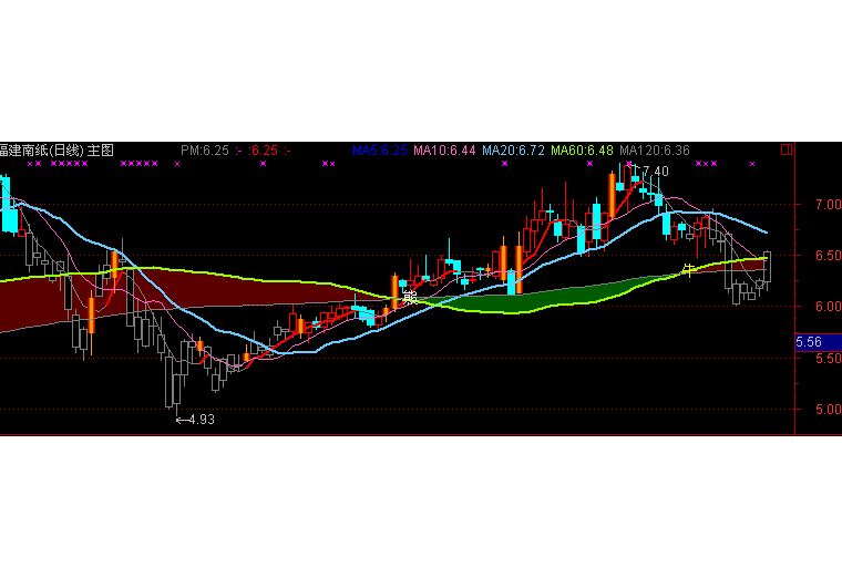 当满足条件MA120上穿MA60时,在MA60位置书写文字,画白色,线宽为2