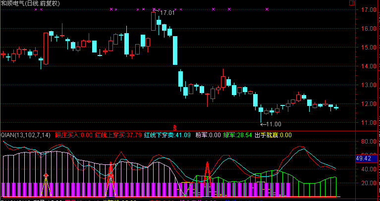 红线下穿卖:EMA(红线上穿买,3),COLORFFFF00;