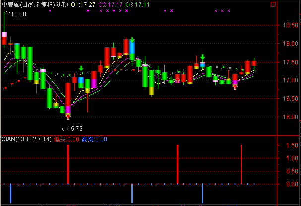 低买:IF(((CROSS(趋势区,2.1))),1.5,0),STICK,COLORRED,LINETHICK3;