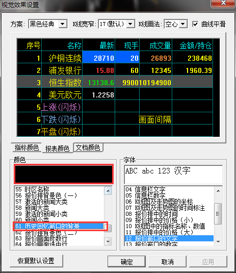 那么怎么办呢?我们只需要把历史回忆的背景颜色改一下就可以了,我们在分时图空白处,右键-属性-颜色和字体,找到历史回忆的背景这一项,颜色改为黑色就可以正常打印了,最下面是我们正常打印的效果图。