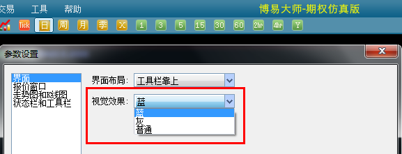 博易技术人员: 可以点击菜单栏“工具——选项——视觉效果”,选择其他的效果。