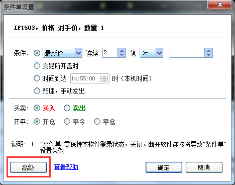 (2)、因为条件单设置窗口为简化显示状态(如图一),点击左下角“高级”按钮,即可显示该选项(如图二)。图一