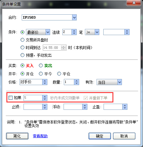 条件单设置窗口为何不显示“如果5秒内未成交则撤单并重新委托”的选项?