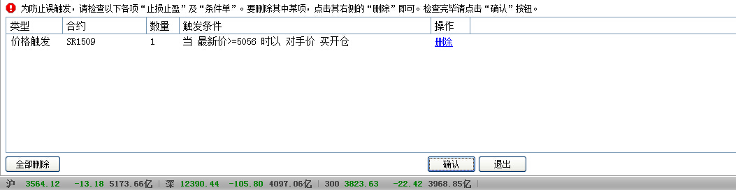 **永久有效**指在触发前均有效,如当日未触发,下次登录交易系统时确认后可继续使用。登陆时的确认界面如下:点击“确认”按钮条件单继续生效,如无需使用,可点击“删除”。