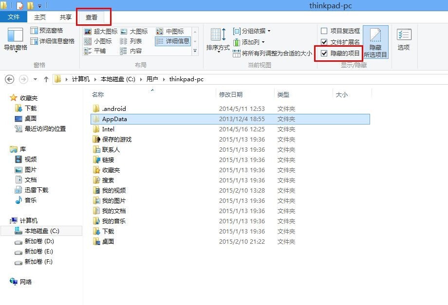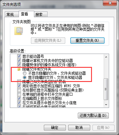 WIN7:系统是在组织-文件夹和搜索选项-查看中选择显示隐藏的文件夹