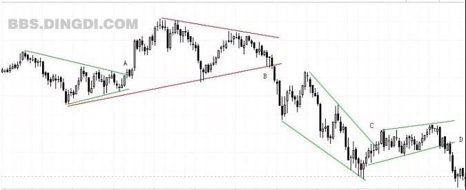 每一组趋势线由两条组成——趋势顶(上轨线)和趋势底(下轨线)。在一定时期内,价格是按照趋势的通道在前进。趋势线并不一定是平行的,虽然在实际操作中,趋势线大多数是平行或接近平行。可以看出,在上图中,A\B\C\D四处出现了“趋势突破”,随后价格就改变了趋势。这也就是趋势线的作用。