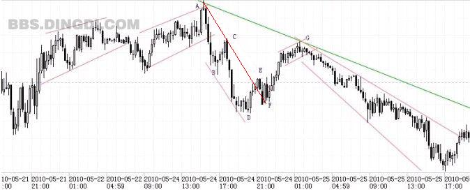 将上面的图形重新画趋势线,如下。红色线段为正确的趋势线,绿色线为错误的趋势线,原因是它忽略了G峰之前的两个明显的峰C、E。