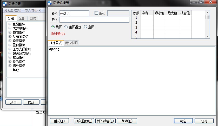 您在K线页面上点击右键技术分析,指标管理,点击新建,之后您新建一个指标函数,您点击下面的插入函数点击左边的行情,右边会出现相应的函数公式。如图:1是结算价指标,图2是开盘价指标