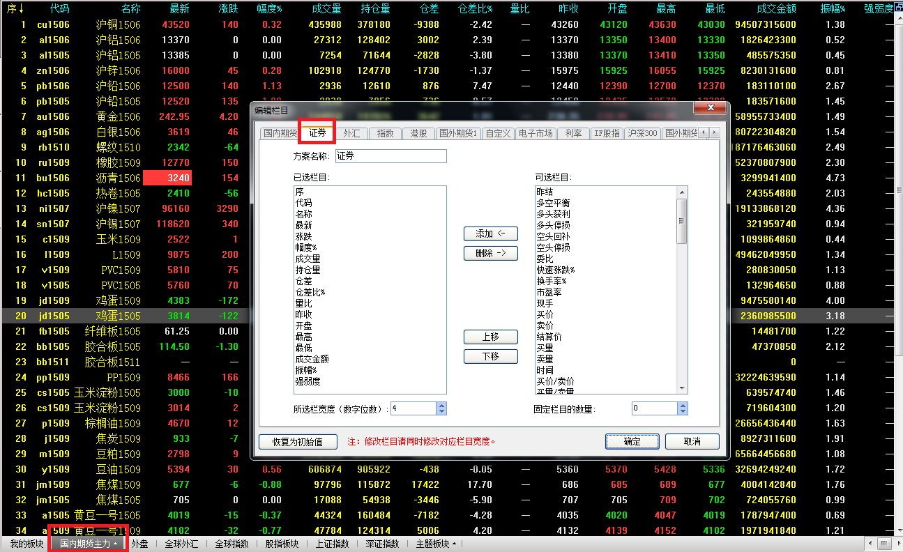 本帖最后由 mypobo 于 2015-4-2 21:30 编辑在新版即将推出之前,我提出旧版的一处小错误,希望能在新版中更正。在更改主力版块的“编辑栏目”时,弹出的窗口显示是编辑“证券”,不知道期货主力为什么被包含在证券栏目里了。在更改“栏目”的宽度和位置后,证券板块里的栏目跟着变化,很不方便使用。