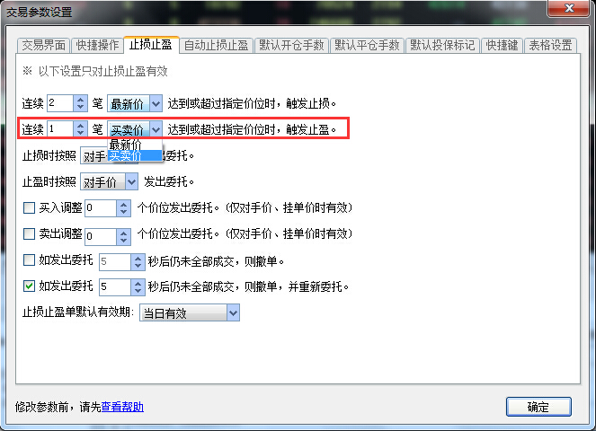 点击“F8参数设置——止损止盈”,第二行设置即为默认的止盈触发条件(如下图),软件默认连续**1**笔**买卖价**达到或者超过止盈价触发止盈,其中连续笔数设置范围为1-6笔,监控价格除了买卖价,也可以选择最新价。您可以根据需要进行修改,修改后点击右下角“确定”按钮即可。