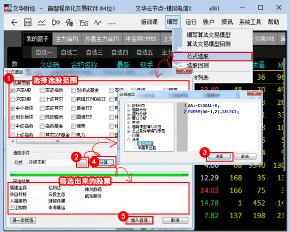 通过右上方菜单【编写】-> 【公式选股】,按下图所示方法,选出符合上述条件的股票。