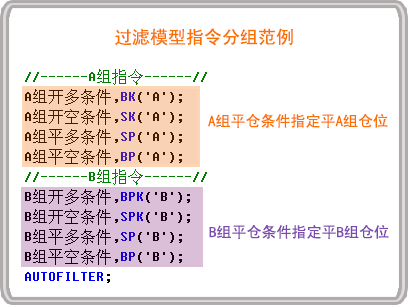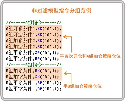 一开一平过滤模型:不同的开仓条件如果想以不同的平仓策略进行平仓,可以利用指令分组来进行控制。如下图 :