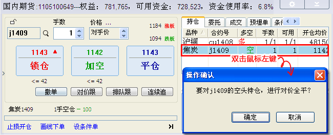 答:在启动了“双击持仓列表快速平仓”的前提下,如果勾选了此项,双击持仓或挂单列表会弹出委托确认框,点击【确认】后再发平仓/撤单委托(例如下图所示);如果不勾选,双击持仓直接发出平仓委托,双击挂单列表直接撤单。