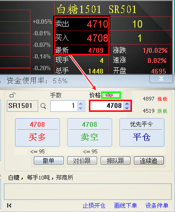 答:勾选后,点击报价列表或盘口的买入/卖出/最新,点击的价格会被抓到三键下单界面的价格处(例如下图红框所示),并且不与合约价格联动。如果需要联动,点击图中绿框中的联动按钮,那么下单界面的价格会与合约的最新价联动;如果不勾选,点击合约后,交易合约的价格框默认显示对手价,点击价格框或者微调按钮才会变成指定价。