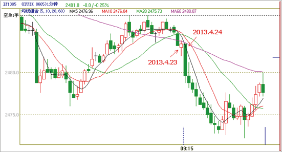 下图为if1305的1分钟k线图,在2013.4.24日开盘价和前一天的收盘价间存在很大跳空,均线受前一天k线数据影响,对开盘的做空趋势反应迟钝。