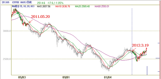 下图为if1305日k线图,合约在交割—挂牌(2011.5.20-2012.3.19)期间存在很大跳空,均线大幅度偏离k线趋势,均线指标失去了分析指导作用。