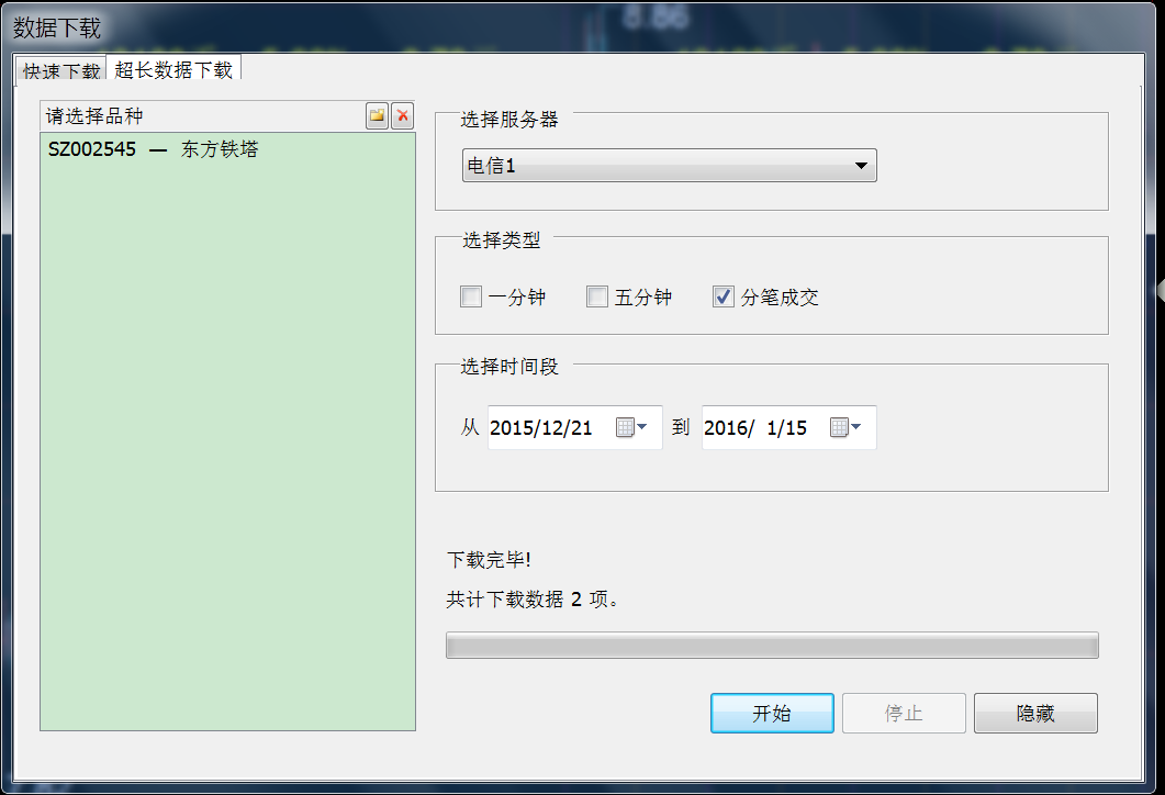 1,下载了东方铁塔002545的从20151221至20160115的分笔数据: