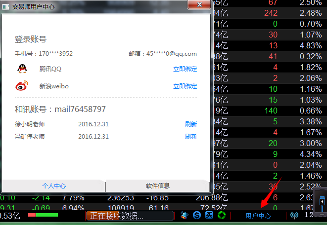 • 网友回复: 2.登录软件之后右下角用户中心点开 查看和讯绑定是否成功 如图所示 Mr.L