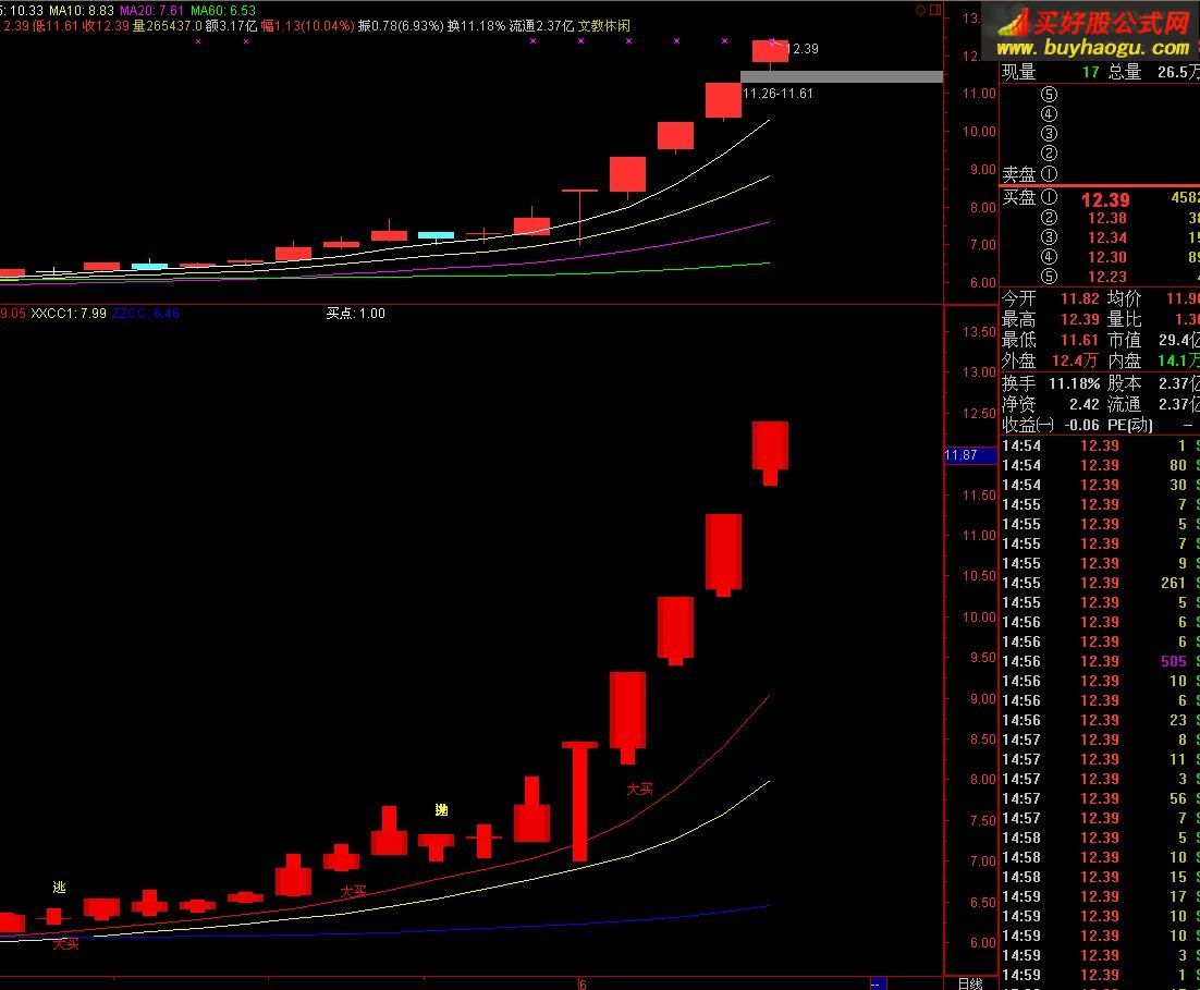 不多说,喜欢的下载,来自网络,非原创,如侵权请告知,谢谢!XXCC: EMA(EMA(EMA(EMA(CLOSE,3),3),3),3),LINETHICK1,COLOR0000FF;XXCC1: EMA(REF(XXCC,1),3),LINETHICK1,COLOR00FFFF;ZZCC: EMA(EMA(EMA(EMA(EMA(CLOSE,65),3),3),3),3),LINETHICK1,COLORFF0000;AA:= MA(WINNER(CLOSE*0.95)*100,3);VAR83:= 1/WINNER(CLOSE);VAR84:= (CLOSE-MA(CLOSE,13))/MA(CLOSE,13)*100;VAR85:= 100-ABS(VAR84);VAR86:= 3*SMA((CLOSE-LLV(LOW,75))/(HHV(HIGH,75)-LLV(LOW,75))*100,20,1)-2*SMA(SMA((CLOSE-LLV(LOW,75))/(HHV(HIGH,75)-LLV(LOW,75))*100,20,1),15,1);VAR87:= 3*SMA((OPEN-LLV(LOW,75))/(HHV(HIGH,75)-LLV(LOW,75))*100,20,1)-2*SMA(SMA((OPEN-LLV(LOW,75))/(HHV(HIGH,75)-LLV(LOW,75))*100,20,1),15,1);VAR88:= 100-VAR87;VAR89:= 100-VAR86;VAR90:= MA(WINNER(CLOSE*0.95)*100,3);VAR91:= IF(VAR83>5,IF(VAR83<100,VAR83,VAR85-10),0);VAR92:= MA(100*(CLOSE-LLV(CLOSE,34))/(HHV(HIGH,34)-LLV(LOW,34)),5)-20;VAR93:= 100-3*SMA((CLOSE-LLV(LOW,75))/(HHV(HIGH,75)-LLV(LOW,75))*100,20,1)+2*SMA(SMA((CLOSE-LLV(LOW,75))/(HHV(HIGH,75)-LLV(LOW,75))*100,20,1),15,1);VAR94:= 100-3*SMA((OPEN-LLV(LOW,75))/(HHV(HIGH,75)-LLV(LOW,75))*100,20,1)+2*SMA(SMA((OPEN-LLV(LOW,75))/(HHV(HIGH,75)-LLV(LOW,75))*100,20,1),15,1);VAR95:= VAR93<REF(VAR94,1) AND VOL>REF(VOL,1) AND CLOSE>REF(CLOSE,1);AAE:= WINNER(CLOSE+CLOSE*15/100)*100;BBE:= WINNER(CLOSE+CLOSE*0/100)*100;CCE:= AAE-BBE;DDE:= (WINNER(CLOSE-CLOSE*0.1/100)-WINNER(CLOSE-CLOSE*15/100))*100;EEE:= CCE<3 AND DDE<0.5 AND OPEN<LOW;AE1:= DYNAINFO(6);AE2:= IF(LOW>AE1,0,IF(HIGH<AE1,1,(AE1-LOW+0.01)/(HIGH-LOW+0.01)));AE3:= VOL/WINNER(LOW);AE4:= REF(HHV(CLOSE,120),1);AE5:= REF(LLV(CLOSE,120),1);AE6:= 100*(CLOSE-AE5)/(AE4-AE5);AE7:= AE2>0 OR AE2=1;AE8:= AE7 AND AE3/REF(AE3,3)>=3 AND AE6<80;AE9:= REF(AE8,1) OR REF(AE8,2) OR REF(AE8,3) OR REF(AE8,4);AE10:= AE8 AND AE9;AE11:= IF(FILTER(AE8,3),5,0);AE12:= FILTER(IF(FILTER(AE10,3) OR EEE,10,0),3);VARA:= (CLOSE-LLV(LOW,9))/(HHV(HIGH,9)-LLV(LOW,9))*100;VARB:= SMA(VARA,3,1);VARC:= SMA(VARB,3,1);探索:= EMA(3*VARB-2*VARC,3);主力:= (-1)*(EMA(VAR89,1)-50)+50;Z1:= MA(主力,9);VARD:= (-1)*(EMA(VAR89,1)-50)+50;VARE:= (-1)*(EMA(VAR89,12)-50)+50;LCC:= REF(CLOSE,1);RSI1:= SMA(MAX(CLOSE-LCC,0),6,1)/SMA(ABS(CLOSE-LCC),6,1)*100;天涯:= IF(RSI1>93 OR AA>90 AND RSI1>80,80,100);苦海:= EMA(100*(HHV(HIGH,14)-CLOSE)/(HHV(HIGH,14)-LLV(LOW,14)),6);ZS:= MA(探索,3);ZM:= MA(MA(探索,3),3);A11:= 3*SMA((CLOSE-LLV(LOW,55))/(HHV(HIGH,55)-LLV(LOW,55))*100,5,1)-2*SMA((CLOSE-LLV(LOW,55))/(HHV(HIGH,55)-LLV(LOW,55))*100,5,1);黑马线:= EMA(A11,5);A12:= (黑马线-REF(黑马线,1))/REF(黑马线,1)*100;A4:= (CLOSE-LLV(LOW,21))/(HHV(HIGH,21)-LLV(LOW,21))*100;趋势线3:= MA(3*SMA(A4,6,1)-2*SMA(SMA(A4,5,1),5,1),2);A5:= (HHV(HIGH,60)-CLOSE)/(HHV(HIGH,60)-LLV(LOW,60))*100;N:= 3;VAR1:= REF((LOW+OPEN+CLOSE+HIGH)/4,1);VAR2:= SMA(ABS(LOW-VAR1),13,1)/SMA(MAX(LOW-VAR1,0),10,1);VAR3:= EMA(VAR2,10);VAR4:= LLV(LOW,33);VAR5:= EMA(IF(LOW<=VAR4,VAR3,0),5);VAR6:= REF(CLOSE,1);VAR7:= SMA(MAX(CLOSE-VAR6,0),6,1)/SMA(ABS(CLOSE-VAR6),6,1)*100;VAR8:= LLV(LOW,5)=LLV(LOW,45) AND CLOSE>=OPEN*1.04;VAR9:= CLOSE>(REF(HIGH,1)+REF(LOW,1))/2;VAR10:= VAR8 AND VAR9;VAR11:= (2*CLOSE+HIGH+LOW)/4;VAR12:= LLV(LOW,13);VAR13:= HHV(HIGH,13);VAR14:= LLV(LOW,1)=LLV(LOW,35) AND CLOSE>=OPEN*1.04;VAR15:= CLOSE>(REF(HIGH,1)+REF(LOW,1))/2;VAR16:= EMA((VAR11-VAR12)/(VAR13-VAR12)*100,13);VAR17:= ((CLOSE-MA(CLOSE,6))/MA(CLOSE,6)*100+(CLOSE-MA(CLOSE,24))/MA(CLOSE,24)*100+(CLOSE-MA(CLOSE,32))/MA(CLOSE,32)*100)/3;VAR18:= 1/WINNER(CLOSE);VAR19:= MA(CLOSE,13);VAR20:= 100-ABS((CLOSE-VAR19)/VAR19*100);VAR21:= LLV(LOW,75);VAR22:= HHV(HIGH,75);VAR23:= (VAR22-VAR21)/100;VAR24:= SMA((CLOSE-VAR21)/VAR23,20,1);VAR25:= SMA((OPEN-VAR21)/VAR23,20,1);VAR26:= 3*VAR24-2*SMA(VAR24,15,1);VAR27:= MA(HHV(HIGH,485),17);VAR28:= MA(HHV(HIGH,222),17);VAR29:= MA(HHV(HIGH,96),17);VAR30:= MA(LLV(LOW,485),17);VAR31:= MA(LLV(LOW,222),17);VAR32:= MA(LLV(LOW,96),17);VAR33:= MA((VAR30*0.96+VAR31*0.96+VAR32*0.96+VAR27*0.558+VAR28*0.558+VAR29*0.558)/6,17);VAR34:= MA((VAR30*1.25+VAR31*1.23+VAR32*1.2+VAR27*0.55+VAR28*0.55+VAR29*0.65)/6,17);VAR35:= MA((VAR30*1.3+VAR31*1.3+VAR32*1.3+VAR27*0.68+VAR28*0.68+VAR29*0.68)/6,17);VAR36:= LLV(LOW,30);VAR37:= MA((VAR33*3+VAR34*2+VAR35)/6*1.738,17);VAR38:= IF(DATE<=1050531,VAR37,VAR37*DAY);VAR39:= LOW;VAR40:= REF(LOW,1);VAR41:= SMA(ABS(VAR39-VAR40),3,1)/SMA(MAX(VAR39-VAR40,0),N,1)*100;VAR42:= MA(IF(CLOSE*1.35<=VAR38,VAR41*10,VAR41/10),N);VAR43:= HHV(VAR42,30);VAR44:= 1080531;VAR45:= 3*VAR25-2*SMA(VAR25,15,1);VAR46:= 100-VAR45;VAR47:= IF(900101<DATE AND DATE<99991232,1,0);VAR49:= REF(LOW,1)*0.9;VAR50:= LOW*0.9;VAR51:= (VAR50*VOL+VAR49*(CAPITAL-VOL))/CAPITAL;VAR52:= EMA(VAR51,30);VAR53:= CLOSE-REF(CLOSE,1);VAR54:= MAX(VAR53,0);VAR55:= ABS(VAR53);VAR56:= SMA(VAR54,7,1)/SMA(VAR55,7,1)*100;VAR57:= SMA(VAR54,13,1)/SMA(VAR55,13,1)*100;VAR58:= BARSCOUNT(CLOSE);VAR59:= SMA(MAX(VAR53,0),6,1)/SMA(ABS(VAR53),6,1)*100;VAR60:= (-200)*(HHV(HIGH,60)-CLOSE)/(HHV(HIGH,60)-LLV(LOW,60))+100;VAR61:= (CLOSE-LLV(LOW,15))/(HHV(HIGH,15)-LLV(LOW,15))*100;VAR62:= SMA((SMA(VAR61,4,1)-50)*2,3,1);VAR63:= (INDEXC-LLV(INDEXL,14))/(HHV(INDEXH,14)-LLV(INDEXL,14))*100;VAR64:= SMA(VAR63,4,1);VAR65:= SMA(VAR64,3,1);VAR66:= (HHV(HIGH,30)-CLOSE)/CLOSE*100;VAR67:= VAR59<=25 AND VAR60<(-95) AND VAR66>20 AND VAR62<(-30) AND VAR65<30 AND VAR52-CLOSE>=(-0.25) AND VAR56<22 AND VAR57<28 AND VAR58>50;VAR68:= (HIGH+LOW+CLOSE)/3;VAR69:= (VAR68-MA(VAR68,14))/(0.015*AVEDEV(VAR68,14));VAR70:= (VAR68-MA(VAR68,70))/(0.015*AVEDEV(VAR68,70));VAR71:= IF(VAR69>=150 AND VAR69<200 AND VAR70>=150 AND VAR70<200,10,0);VAR72:= IF(VAR69<=(-150) AND VAR69>(-200) AND VAR70<=(-150) AND VAR70>(-200),-10,VAR71);VAR73:= (CLOSE-LLV(LOW,27))/(HHV(HIGH,27)-LLV(LOW,27))*100;VAR74:= REVERSE(VAR73);VAR75:= SMA(VAR73,3,1);绝佳买点:= IF(DATE<=VAR44,MA(IF(LOW<=VAR36,(VAR42+VAR43*2)/2,0),N),100000000);跑:= FILTER(REF(黑马线,1)>90 AND A12<0 ,7);买线:= EMA(CLOSE,2);卖线:= EMA(SLOPE(CLOSE,21)*20+CLOSE,42);指數位置:= 3*SMA((CLOSE-LLV(LOW,27))/(HHV(HIGH,27)-LLV(LOW,27))*100,5,1)-2*SMA(SMA((CLOSE-LLV(LOW,27))/(HHV(HIGH,27)-LLV(L