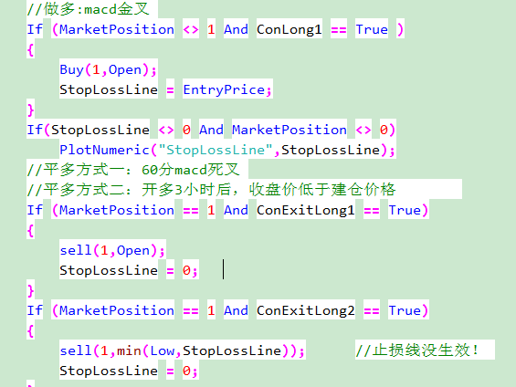 ConExitLong2 = BarsSinceEntry > 3 And Low < StopLossLine ; //平多方式二:开多3小时后,收盘价低于建仓价格