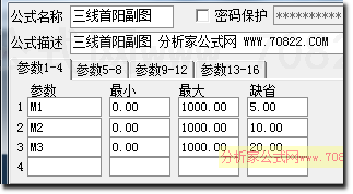 {三线首阳副图}M5:=MA(CLOSE,M1);M10:=MA(CLOSE,M2);M20:=MA(CLOSE,M3);MA2:=EMA(C,2);MA5:=EMA(C,5);MA10:=EMA(C,10);MA20:=EMA(C,20);YCX:=M5>REF(M5,1);H1:=MAX(MAX(M5,M10),M20);L1:=MIN(MIN(M5,M10),M20);XG:=REF(((HHV(H,20)-LLV(L,20))*100/LLV(L,20))<10,1);一阳穿三线:H1<C AND O<L1 AND YCX AND MA2>REF(MA2,1) AND XG;{程序化交易 www.cxh99.com }
