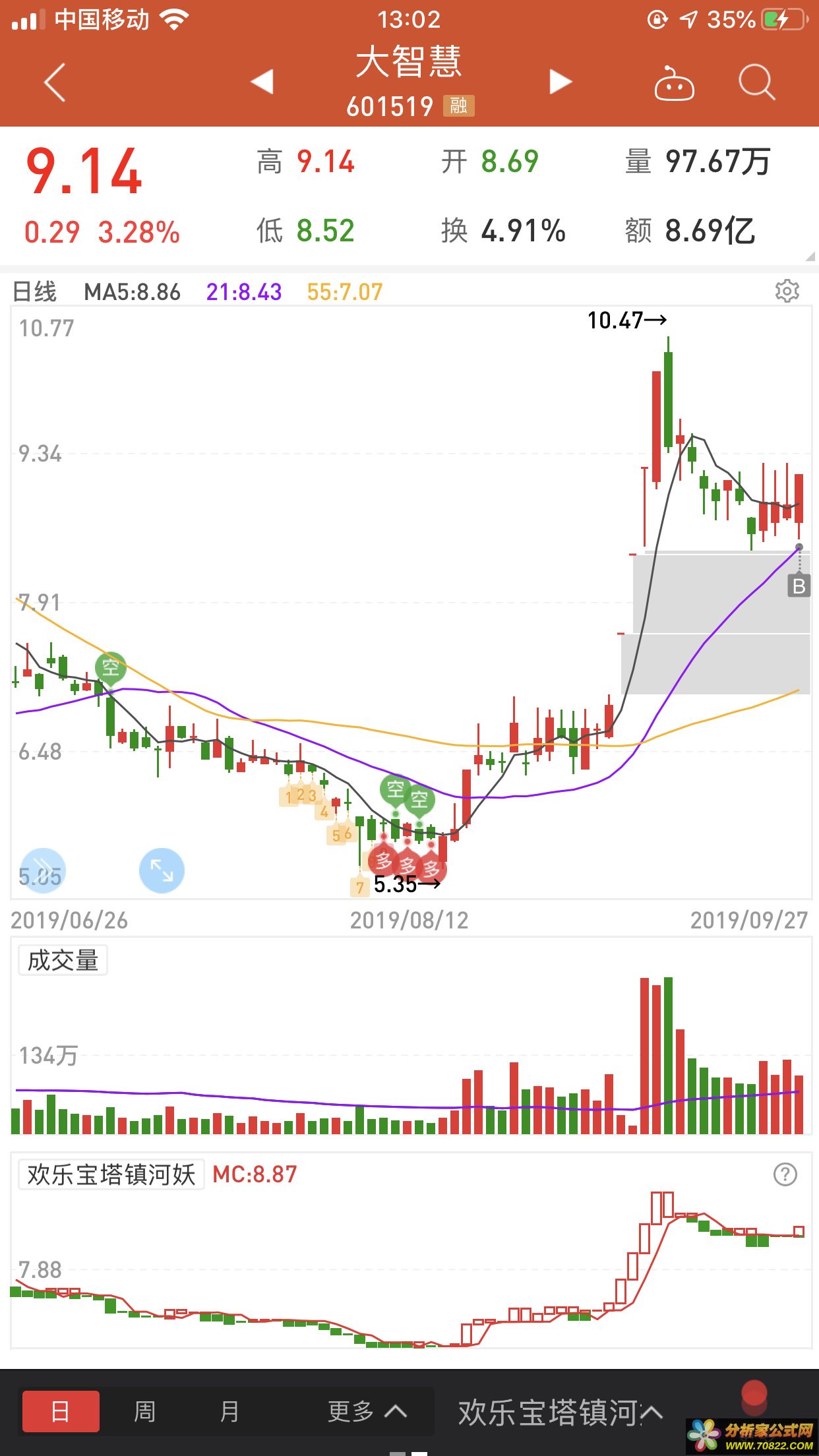 mc指标:根据代码可以计算出mc指标,它根据SS指标和SM指标的取值选择相应的数值作为mc的值。当SS指标的前一天的值不等于0时,mc等于B2;当SM指标大于0时,mc等于B1和B2中的较小值;当SM指标小于等于0时,mc等于B1和B2中的较大值。该指标可以用来标记买入点和卖出点。
