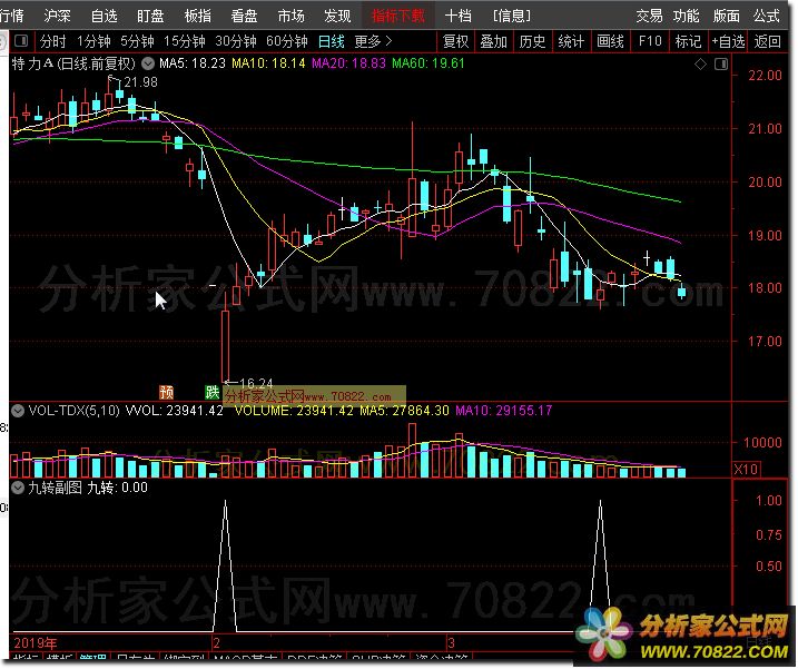 - 当九转指标(T9为真)出现时,意味着股票价格连续九天下跌,可能预示着短期的下降趋势。