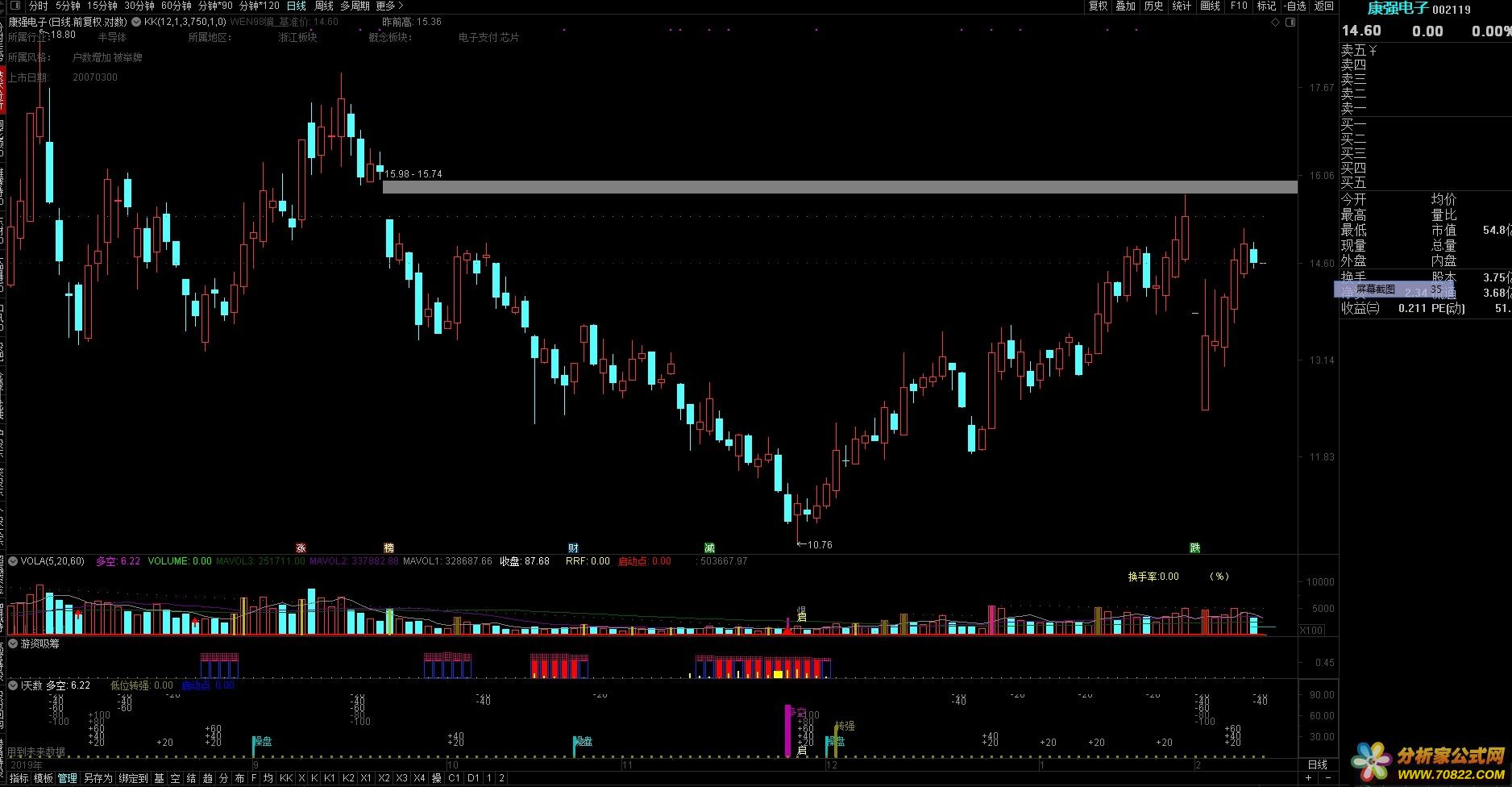 源码:cxhF1:=TROUGHBARS(3,15,1)<4;多空:EMA((CLOSE-MA((2*CLOSE+HIGH+LOW)/4,30))/MA((2*CLOSE+HIGH+LOW)/4,30)*100,3),NODRAW;STICKLINE(FILTER(cxhF1=1,5) AND 多空<-10,75,0,1.6,0),COLORAA00BB;DRAWTEXT(STICKLINE(FILTER(cxhF1=1,5) AND 多空<-10,75,0,1.6,0),65,'多空'),COLORAA00BB;cxh200:=(CLOSE-LLV(LOW,20))/(HHV(HIGH,20)-LLV(LOW,20))*100;cxh300:=SMA(SMA(cxh200,3,1),3,1)/28.57;cxh400:=EMA(cxh300,5);操盘:=3*cxh300-2*cxh400;PS1:=CROSS(操盘,cxh300) AND cxh300<2.1 AND C>O;STICKLINE(PS1,30,0,0.3,0),COLORLIBLUE;DRAWTEXT(PS1,23,'操盘'),COLORLIBLUE;{信号}AA5X:=3*SMA((CLOSE-LLV(LOW,18))/(HHV(HIGH,18)-LLV(LOW,18))*100,21,1)-2*SMA(SMA((CLOSE-LLV(LOW,18))/(HHV(HIGH,18)-LLV(LOW,18))*100,20,1),8,1),CIRCLEDOT,NODRAW ;低位转强:IF(CROSS(AA5X,20),45,0),STICK,COLOR008888,LINETHICK4;DRAWTEXT((低位转强>0),45,'转强'),COLOR008888;HJ_1:=REF(LOW,1);HJ_2:=SMA(ABS(LOW-HJ_1),13,1)/SMA(MAX(LOW-HJ_1,0),13,1)*100;HJ_3:=EMA(IF(CLOSE*1.2,HJ_2*13,HJ_2/13),13);HJ_4:=LLV(LOW,34);HJ_5:=HHV(HJ_3,34);HJ_6:=IF(LLV(LOW,56),1,0);HJ_7:=EMA(IF(LOW<=HJ_4,(HJ_3+HJ_5*2)/2,0),3)/618*HJ_6;HJ_8:=HJ_7>REF(HJ_7,1);HJ_9:=REF(LLV(LOW,100),3);HJ_10:=REFDATE(HJ_9,DATE);HJ_11:=LOW=HJ_10;{程序化久久股票公式网}HJ_12:=HJ_8 AND HJ_11;HJ_13:=HJ_12>REF(HJ_12,1);启动点:HJ_13>REF(HJ_13,1),NODRAW;DRAWTEXT(启动点,10,'启'),COLOR99FFFF;B3L:DRAWTEXT(CROSS(ZIG(3,4),REF(ZIG(3,4),1)),20,'+20'),COLOR999999;B6L:DRAWTEXT(CROSS(ZIG(3,8),REF(ZIG(3,8),1)),30,'+40'),COLOR999999;B9L:DRAWTEXT(CROSS(ZIG(3,12),REF(ZIG(3,12),1)),40,'+60'),COLOR999999;B12:DRAWTEXT(CROSS(ZIG(3,16),REF(ZIG(3,16),1)),50,'+80'),COLOR666666;B15:DRAWTEXT(CROSS(ZIG(3,20),REF(ZIG(3,20),1)),60,'+100'),COLOR666666;S15:DRAWTEXT(CROSS(REF(ZIG(3,20),1),ZIG(3,20)),50,'-100'),COLOR666666;S12:DRAWTEXT(CROSS(REF(ZIG(3,16),1),ZIG(3,16)),60,'-80'),COLOR666666;S9:DRAWTEXT(CROSS(REF(ZIG(3,12),1),ZIG(3,12)),70,'-60'),COLOR999999;S6:DRAWTEXT(CROSS(REF(ZIG(3,8),1),ZIG(3,8)),80,'-40'),COLOR999999;S3:DRAWTEXT(CROSS(REF(ZIG(3,4),1),ZIG(3,4)),90,'-20'),COLOR999999;{程序化交易 www.cxh99.com }
